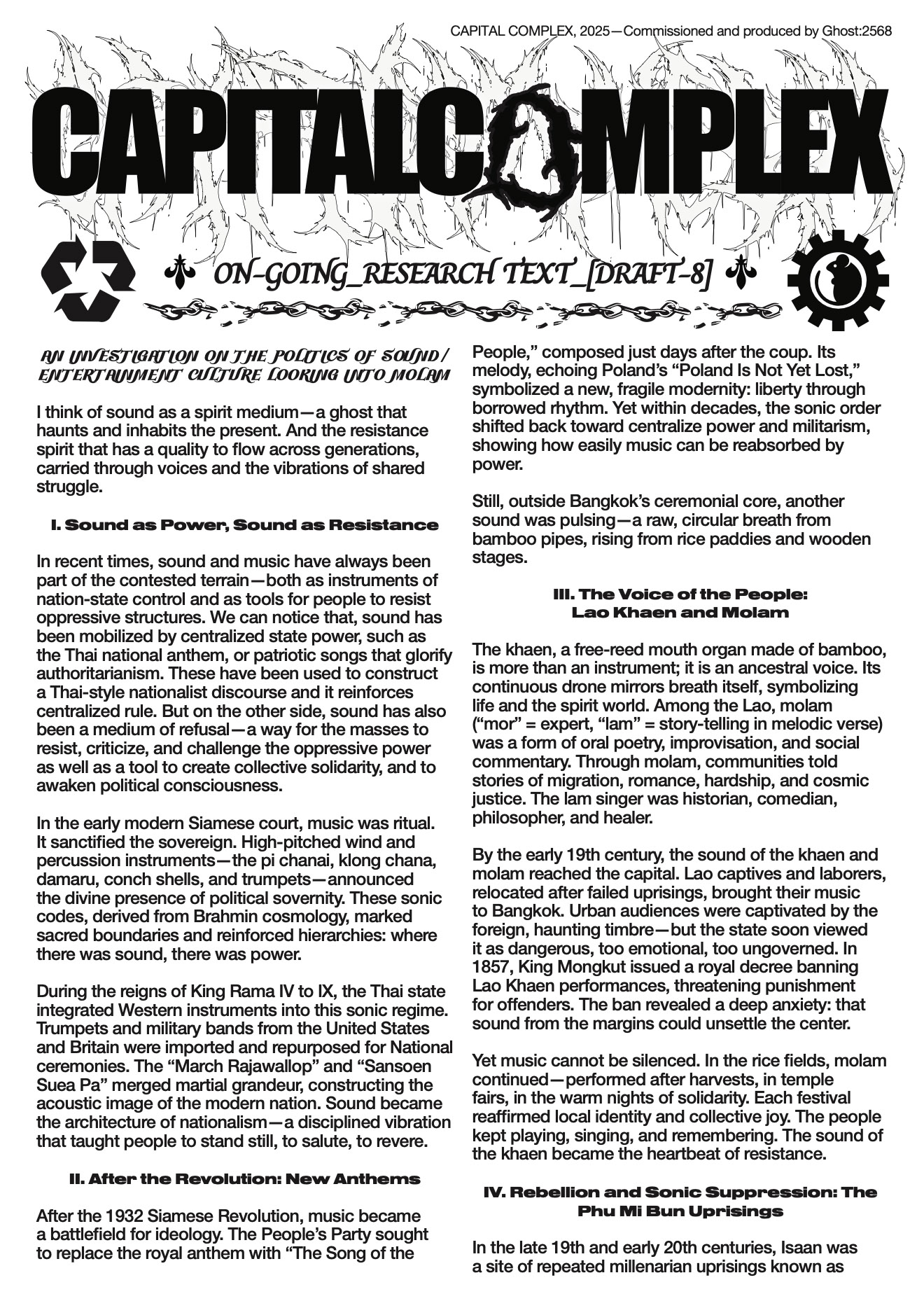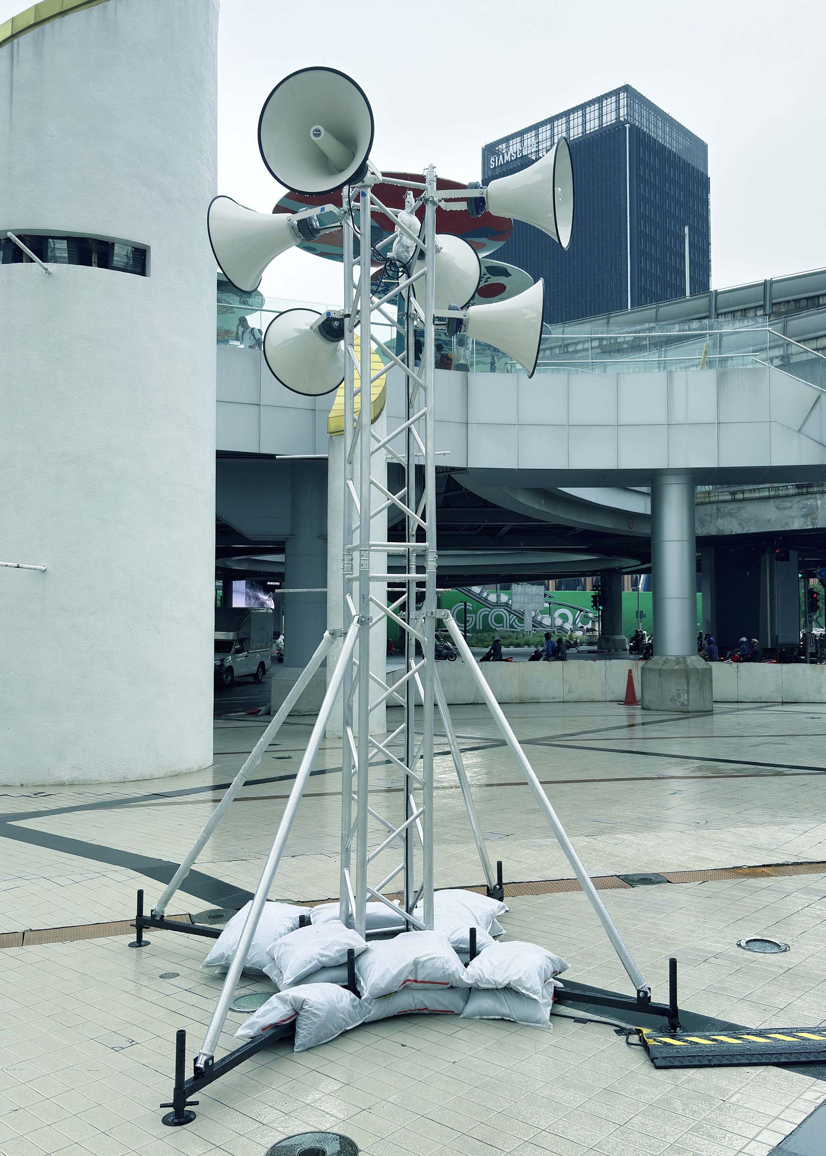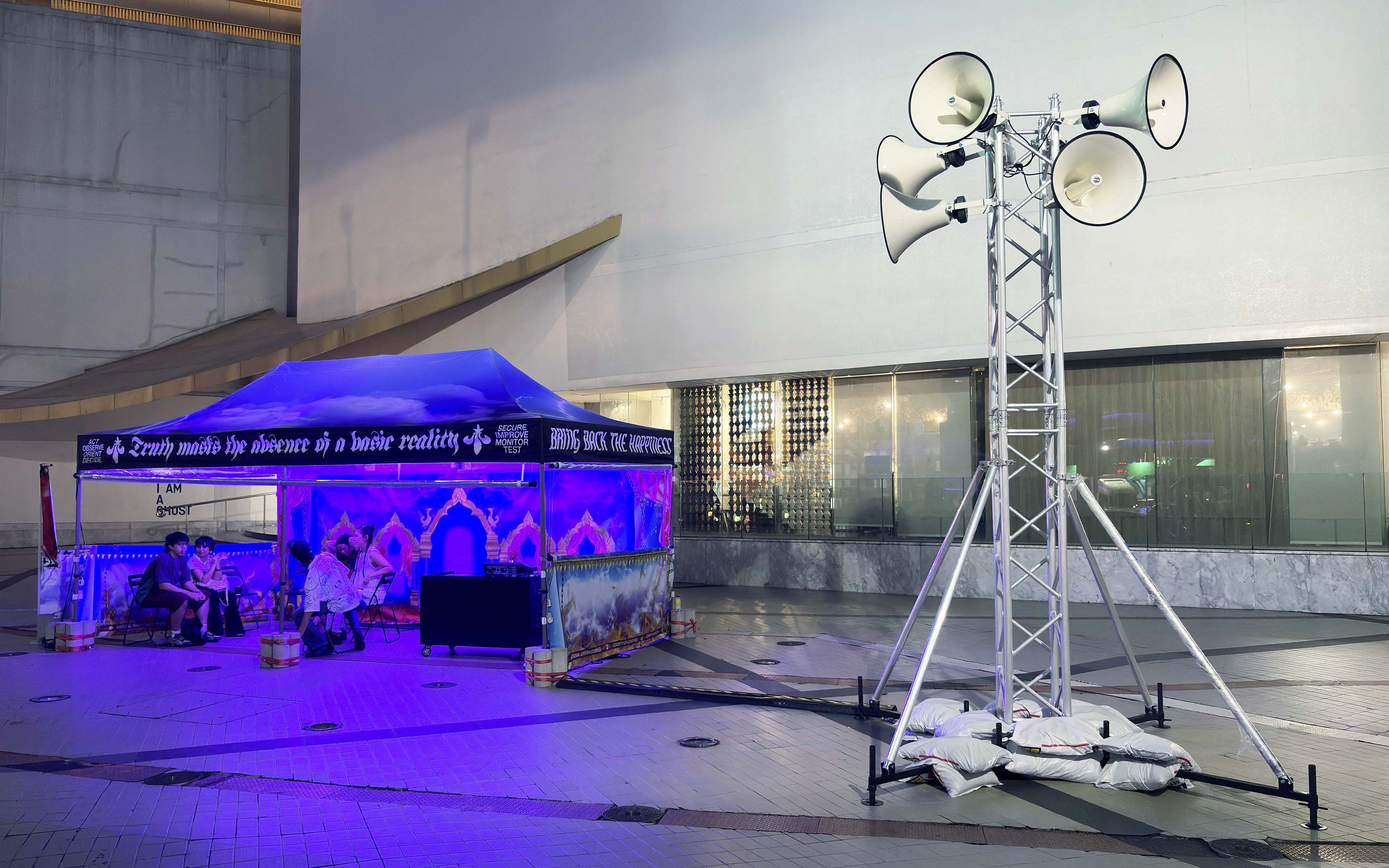 CAPITAL COMPLEX (2025)” is a broadcast station/platform-infrastructure that imagines a “new model of the tourism industry” as a tool to provoke reflection and critique on historical narratives that have been obscured or erased. Using sound as a primary medium to explore inaudible frequencies that exist beyond the threshold of everyday perception, hidden within the various locations in Bangkok. The work invites acts of listening, remembering, and questioning—amplifying echoes of voices long silenced.