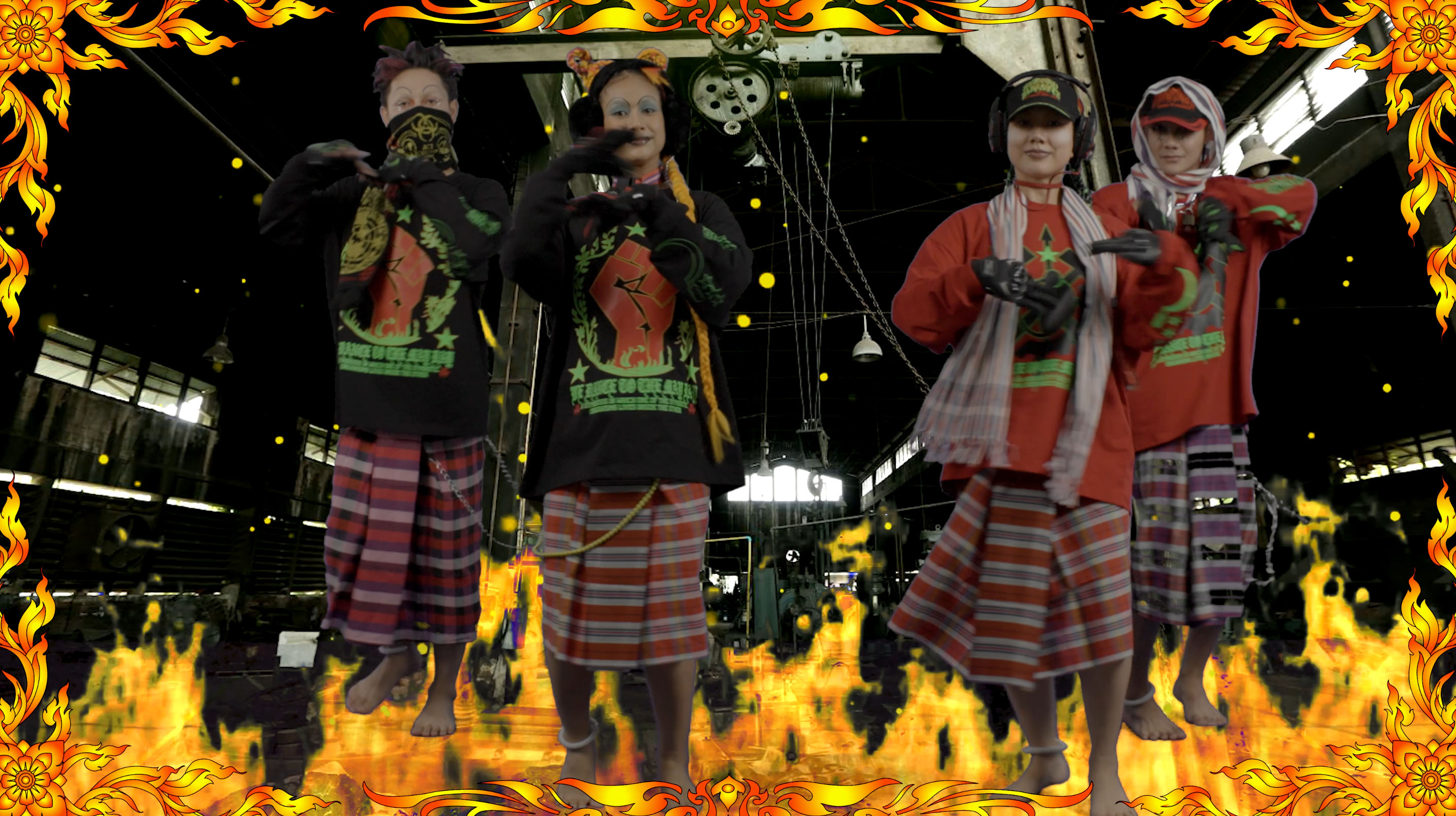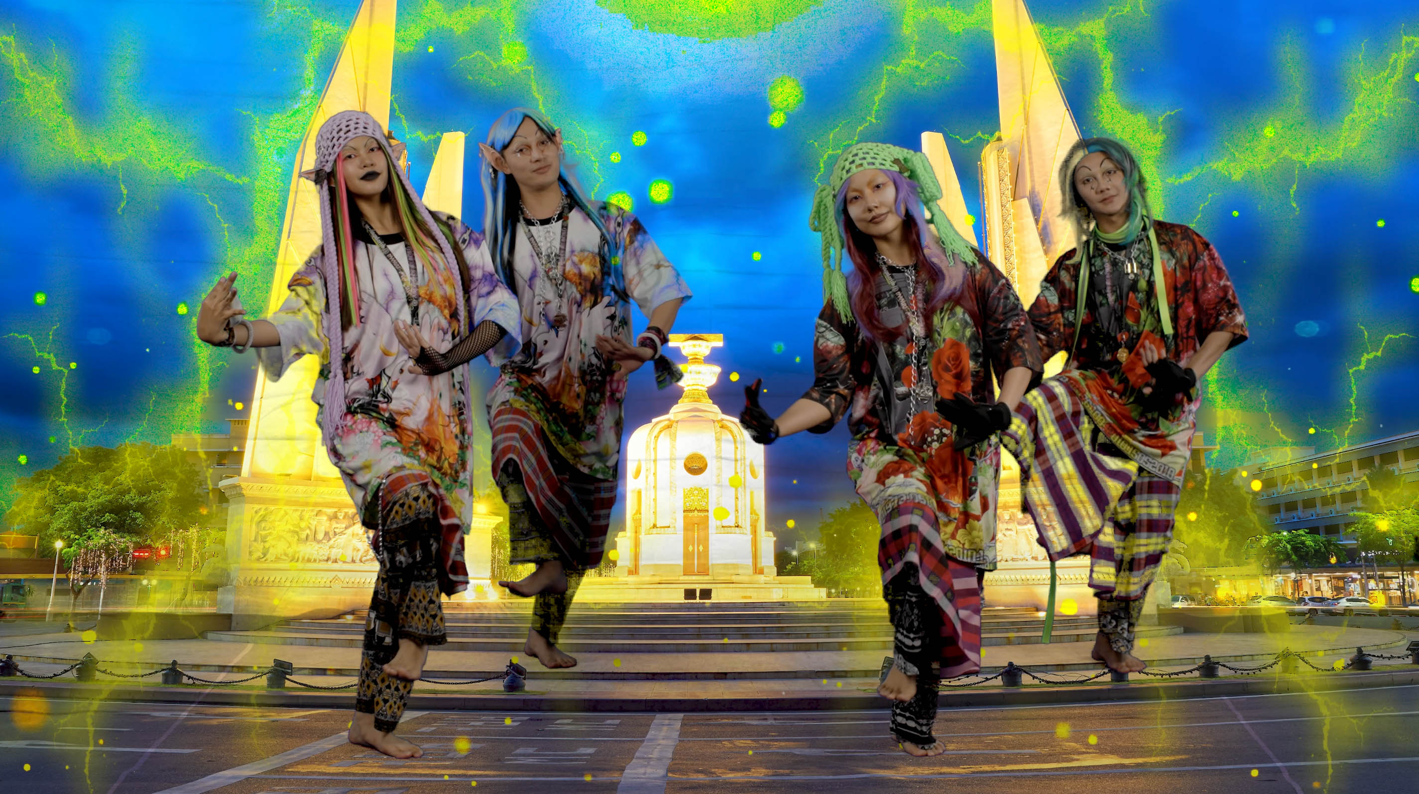 NATIONAL OPERA COMPLEX is an on-going project/multimedia body of works exploring power, culture, and resistance. The single-channel video is embedded within a merchandise booth resembling a tourist souvenir kiosk, critiquing the commodification of cultural identity. Blending traditional Thai folk dance with revolutionary music, the work examines how media and state propaganda manipulate cultural forms. It references nationalist leader Plaek Phibunsongkhram’s use of the Ram-vong dance for state control, juxtaposing it with protest songs across five fictional chapters. Styled as a “TV-PSYOP” program, the video merges dance tutorials, news broadcasts, and historical archives to explore how sound and movement shape the ideology, challenging the viewers to reflect on how cultural heritage is packaged and sold, questioning the role of soft power in shaping the notion of national identity.
