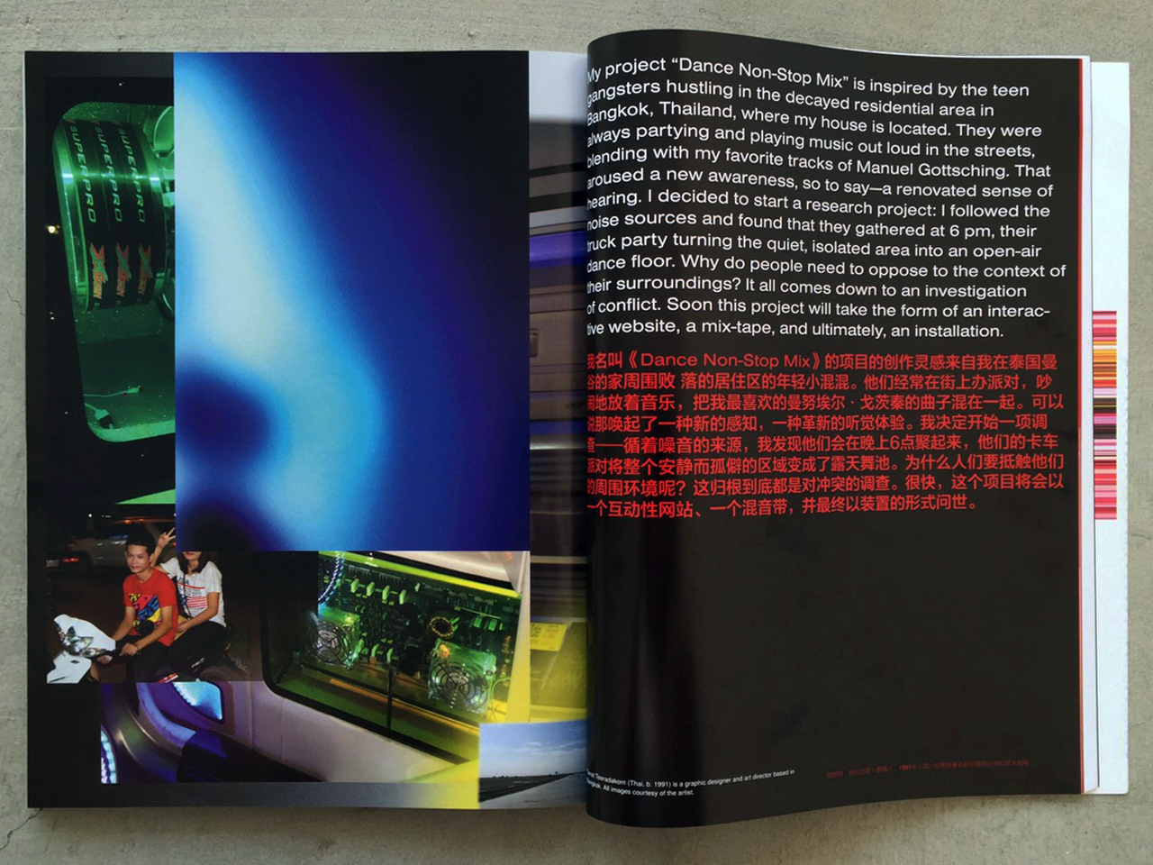 Dance Non-Stop Mix is an ongoing research-based project started in 2015. The project inspired by the teenager group hustling in the decayed residential area in Bangkok, Thailand, where my house is located. They were always partying and playing music out loud in the streets, blending with my favorite tracks. That aroused a new awareness, so to say—a renovated sense of hearing. I decided to start a research project: following the noise sources and found that they gathered at 6 pm, their truck party turning the quiet, isolated area into an open-air dance floor. Why do people need to oppose the context of their surroundings? It all comes down to an investigation of conflict.